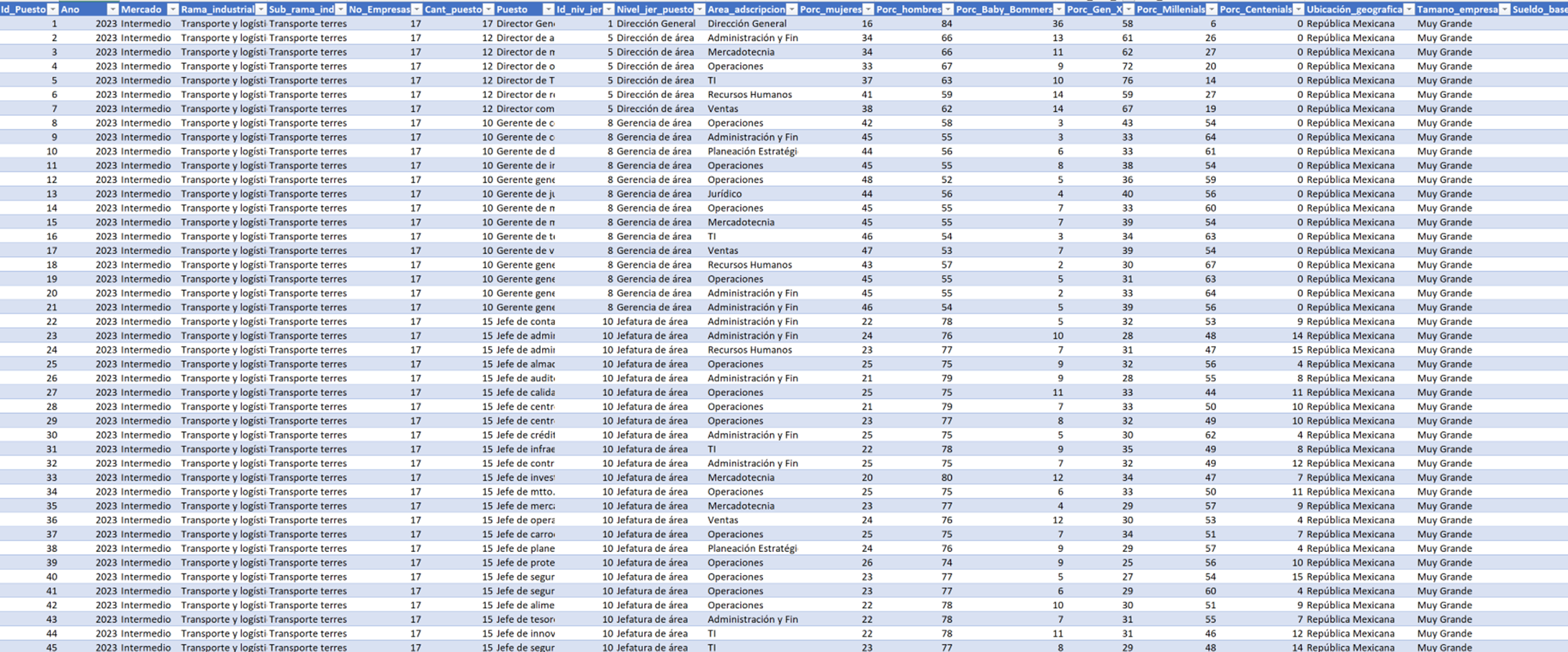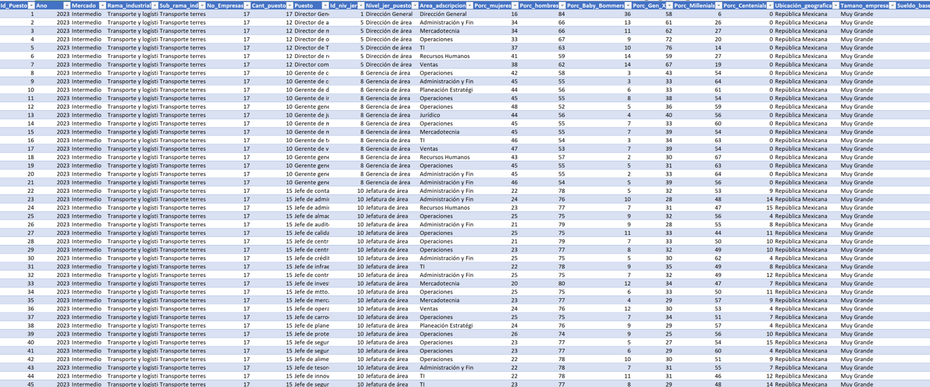 Aproveche al máximo la vasta cantidad de datos disponibles. Nuestra base de datos está diseñada para facilitarle la explotación de información, permitiéndole identificar rápidamente patrones, tendencias y áreas clave de interés, aunado a que podrá crecerla a futuro con la adquisición de actualizaciones en años posteriores (para generar comparativos entre periodos) o introduciendo segmentos de información de otras ramas de actividad económica, dimensiones de empresa o zonas geográficas no adquiridas originalmente, pero que detecte que están incidiendo en el "robo" de talento que esté migrando de su empresa hacia allá.