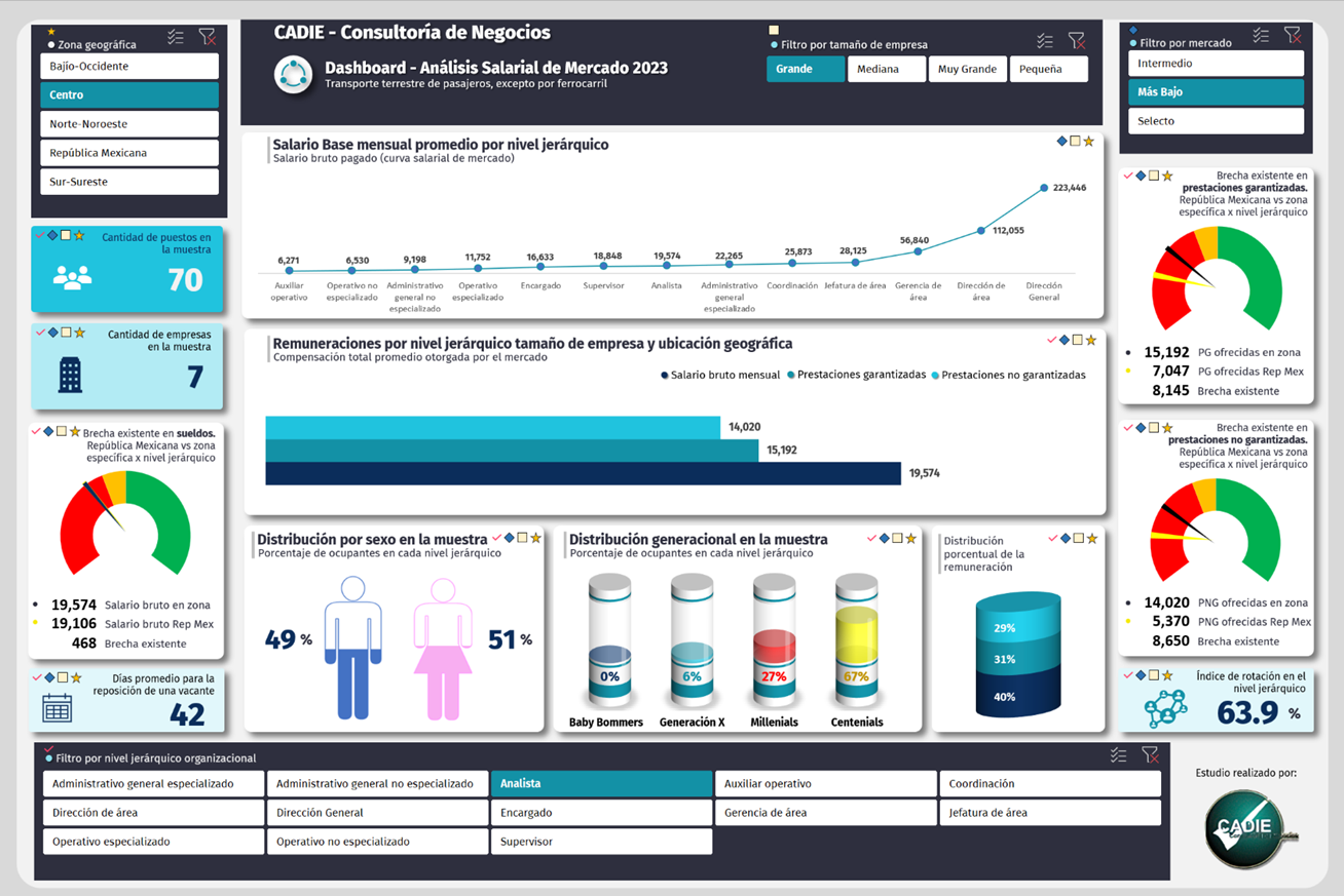 Con lo cual puede saberse al instante las brechas que hay en cada rubro de remuneración de la zona geográfica seleccionada vs lo que es el promedio que maneja el mercado a nivel República Mexicana, así como las características demográficas de la muestra (sexo, rangos de edad de los ocupantes de los niveles jerárquicos elegidos, la cantidad de puestos que hay en la muestra, etc.). De igual forma se obtiene información respecto a la distribución porcentual de cada rubro que integra la remuneración total en el segmento jerárquico seleccionado y el índice de rotación promedio que se presenta en dicho nivel y el número de días que tarda (también en promedio) reponer una vacante.