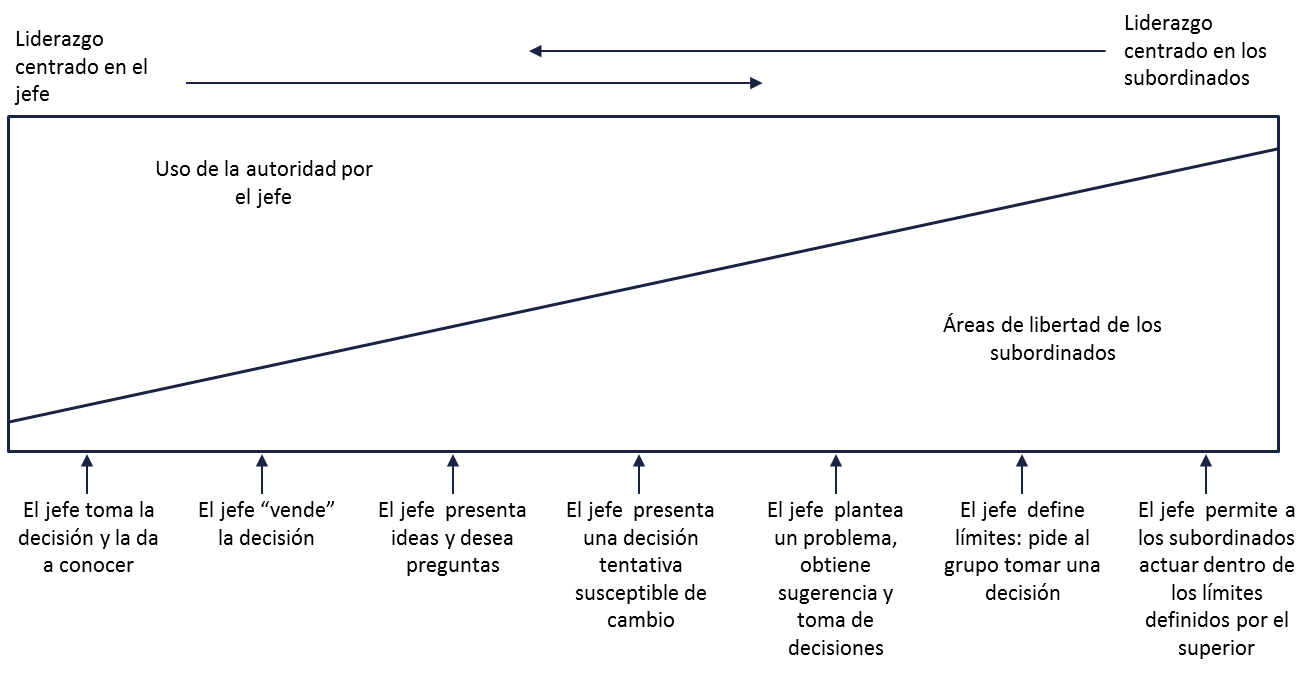 El liderazgo es la capacidad de influir que tiene una persona sobre un grupo para la consecución de metas. Con independencia de si quien lo ejerce posee o no autoridad formal dentro de la organización. Existen variados estilos de liderazgo, los cuales pueden variar en un contiunuum y tomar varios matices según lo exponen Tannenbaun y Warren en el gráfico que se muetra a continuación: