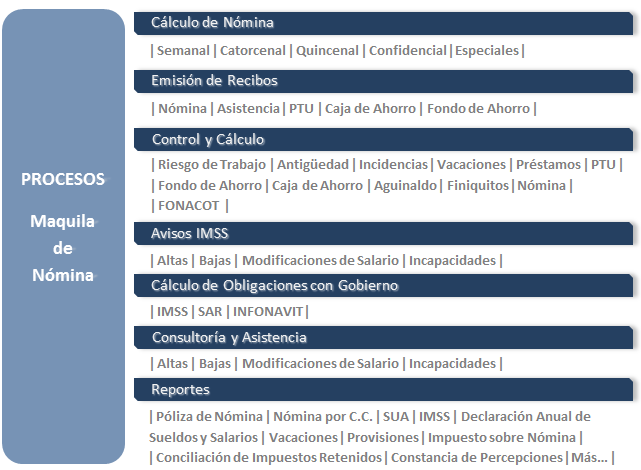 Con el propósito de Ud. pueda abocarse a mantener toda su atención en la operación de su negocio, le apoyamos en la elaboración de la nómina de su personal, es decir un auténtico servicio de outsourcing de nóminas. Si su empresa no cuenta con un especialista en la materia que esté dedicado de tiempo completo a dicha función, puede subcontratar este servicio con nosotros y tener la tranquilidad de que estará cumpliendo con los requisitos legales vigentes y que el pago de la nómina a sus empleados se realizará de manera adecuada en tiempo y forma, con lo cual la operación de su negocio dispondrá de toda su atención, sin tener pendientes que le distraigan y absorban tiempo innecesario en una tarea de rutina.