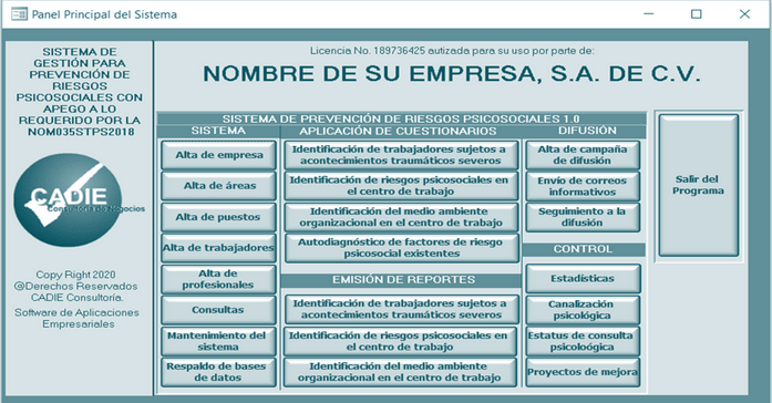 Para apoyarle en el cumplimiento de parte de lo que exige la NOM035 STPS 2018 en relación con la aplicación periódica entre su personal de evaluaciones para detectar problemáticas relacionadas con la ocurrencia de eventos traumáticos severos y la identificación de los factores psicosociales de riesgo en el ámbito laboral y del ambiente organizacional existente para prevenirlos. CADIE ha desarrollado un software que le permitirá cumplir con la misma, de una manera sencilla, además de poder hacer una explotación muy útil de la información, encaminada a mejorar continuaamente su sistema de prvención implantado para tal fin.